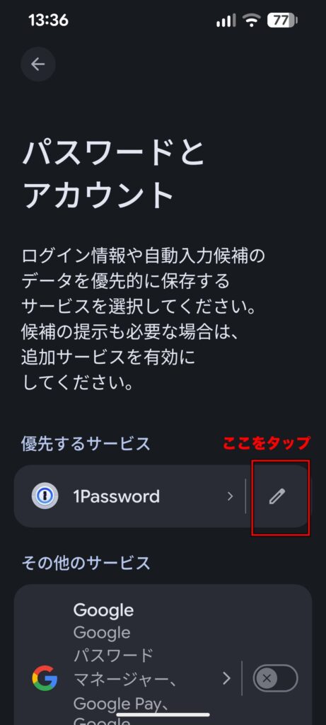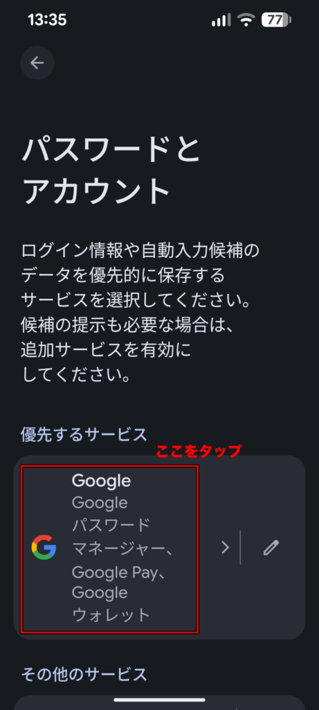 - 2:「設定」>「自動入力とパスワード」>「Googleパスワードマネージャー」