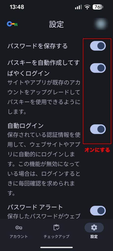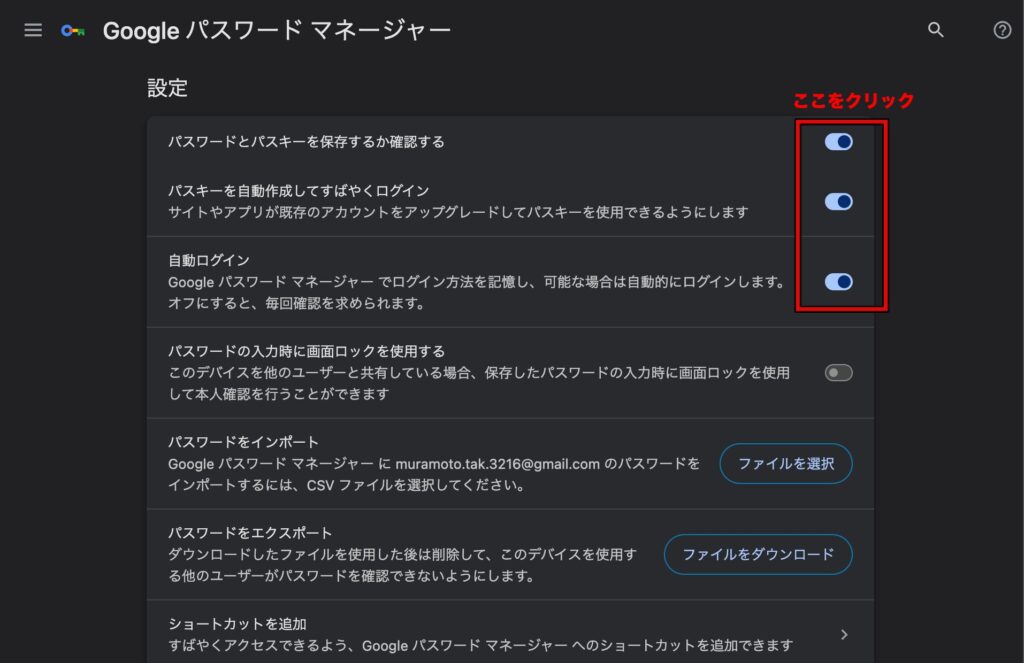 - 3:Googleパスワードマネージャーの設定を開き、「パスワードとパスキーを保存するか確認する」「パスキーを自動作成してすばやくログイン」「自動ログイン」をオンにする。