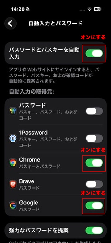 - 3:「パスワードとパスキーを自動入力」で「パスワードとパスキーを自動入力」をオンにし、「その下の自動入力の取得元」で「Chrome」と「Google」※をオンにする。